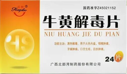 药品名称 牛黄解毒片 通用名称 牛黄解毒片 商品名/品牌 主要成份 人工牛黄、雄黄、石膏、大黄、黄芩、桔梗、冰片、甘草。 性状 本品为素片,显棕黄色;有冰片香气,味微苦、辛。 功效与作用 清热解毒。用于火热内盛,咽喉肿痛,牙龈肿痛,口舌生疮,目赤肿痛。 用法用量 口服。一次3片,一日2-3次。 副作用 尚不明确。 禁忌 尚不明确。 注意事项 孕妇禁用。 请仔细阅读说明书并遵医嘱使用。 相互作用 如与其他药物同时使用可能会发生药物相互作用,详情请咨询医师或药师。 贮藏 置阴凉干燥处。 有效期 36 月 批准文号 国药准字Z45021152 生产企业 广西北部湾制药股份有限公司